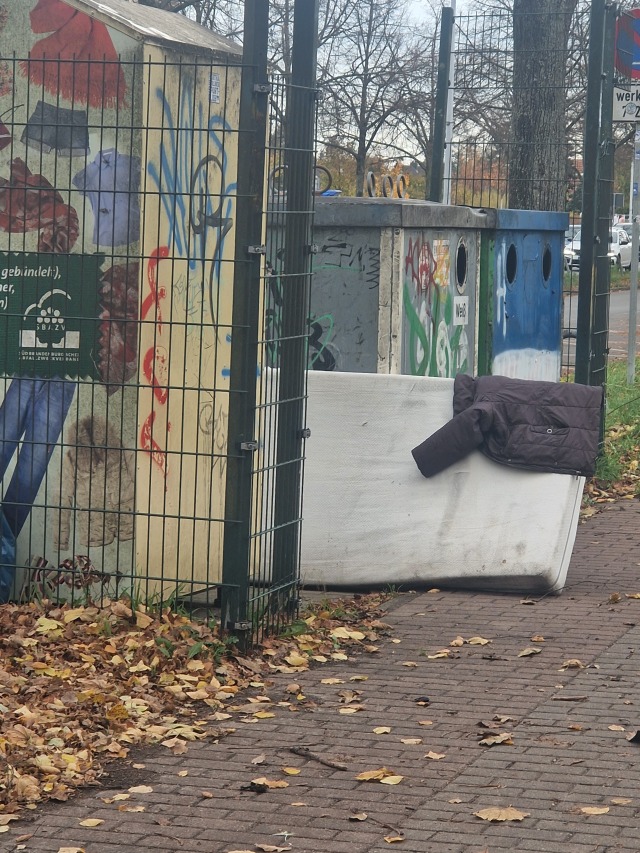 Foto: Matratze am Kleidercobtainer neben Bushaltestelle