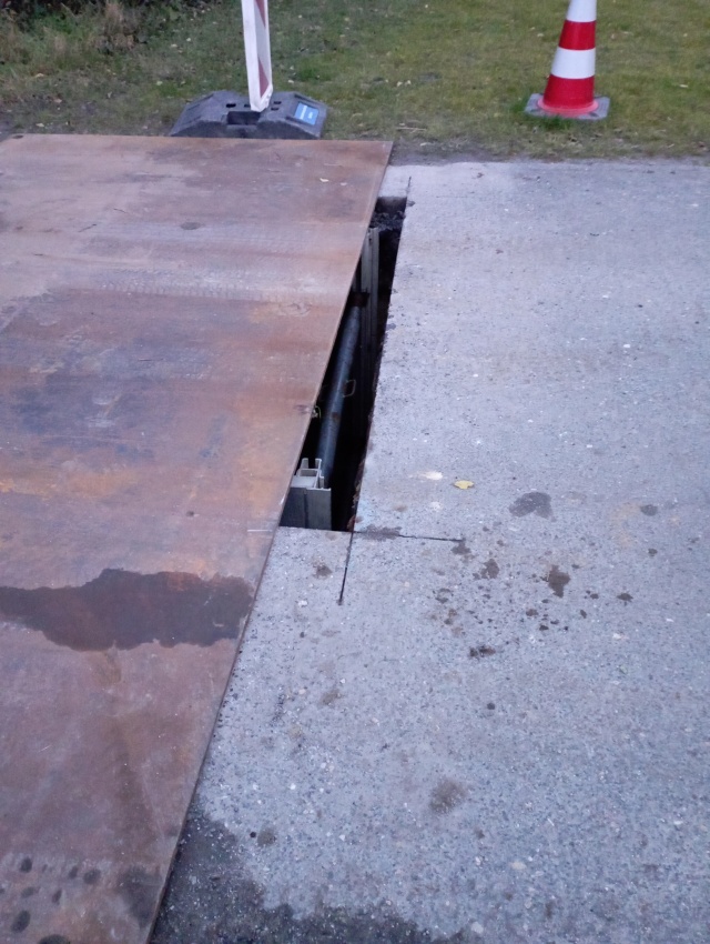 Sehr große Unfallgefahr durch nicht ausreichende Abdeckung der Ausschachtungen auf der Straße für die Verlegung der neuen Wasserleitung. Der Abstand zwischen Asphalt und Stahlplatte beträgt etwa 15 cm und ist besonders für Fahrradfahrer gefährlich. L