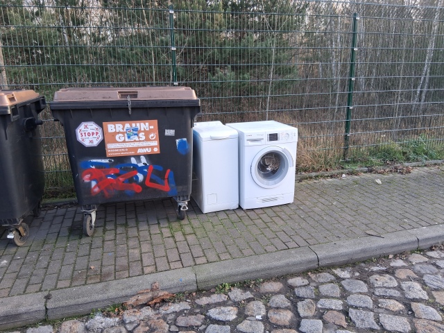 Es stehen zwei Waschmaschinen bei den Altglasscontainern
